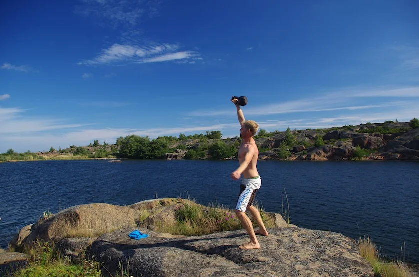 So we’re staying here another night, and I’m very pleased with that decision. Mia and I spent the morning training on the rocks just by the bow of the boat, me doing a kettlebell routine while Mia did some pushups and situps and a bit of yoga. Afterwards we did some running rehab-type exercises with Mia’s stretchy band she’s had since her swimming days, designed to strengthen the hip and lower back muscles, the small muscles that get so tired by the end of a marathon and which destroy your running form if they’re not in shape. I set up a little rope climb in the rigging and plan to send the photos to my friend Dane Miller, the former PA State Champ in shot-put who now runs the Garage Strength gym back home in Berks County, in an effort to convince him to open up ‘Garage Strength Finland’ here on the red rocks of Åland. Then, since the bay was ours alone, we went for another naked swim, which has sort of become routine on this trip. There is nothing like a little morning chill to wake up the system, and a hot cup of coffee afterwards never tasted so good.