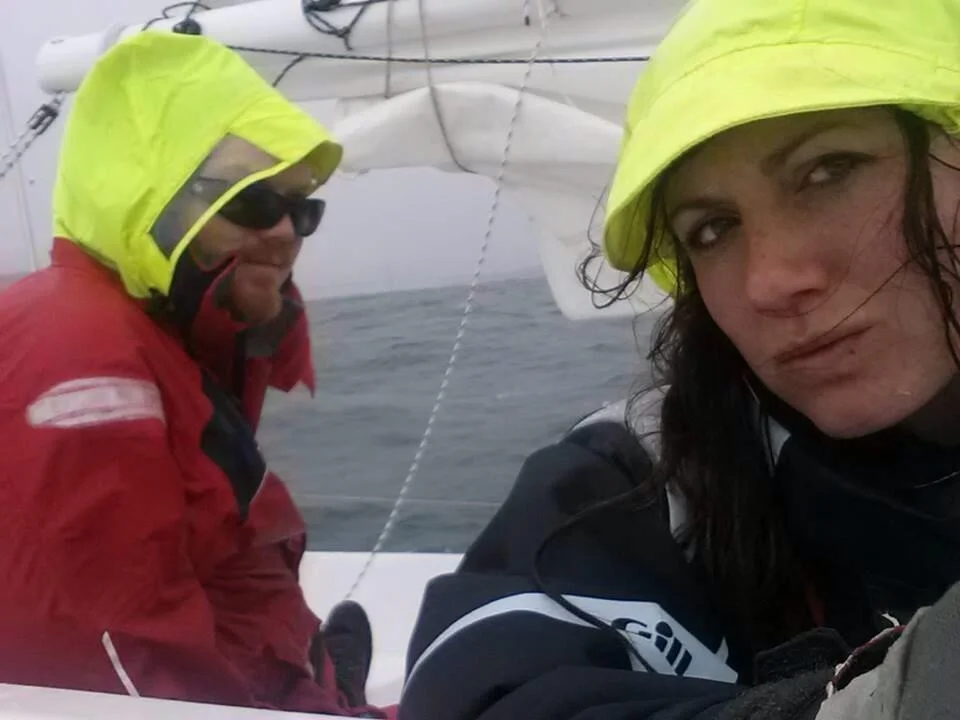 Matt Rutherford & Nicole Trenholm depart a wet and windy San Francisco Bay on tiny Sakura.