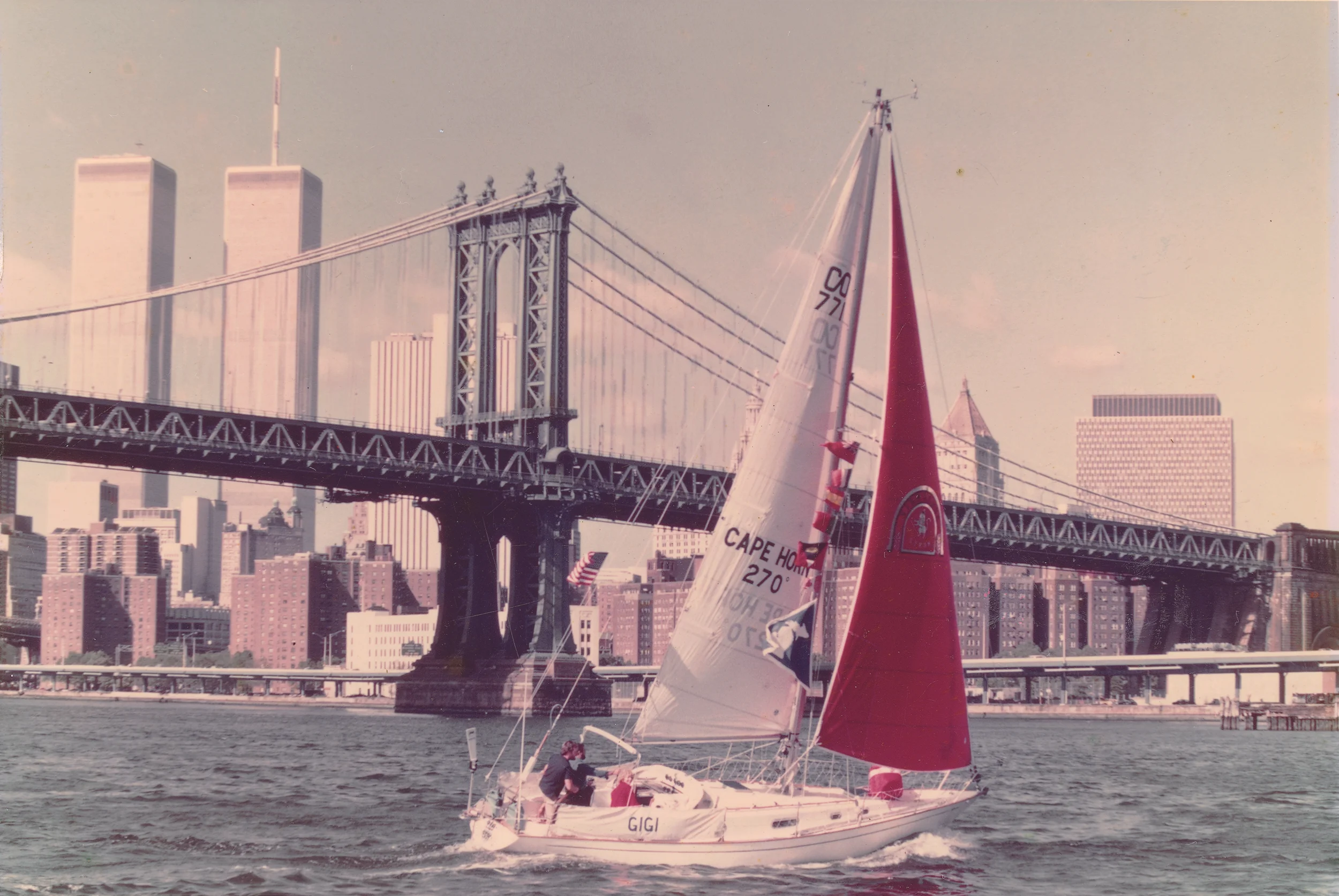 We shortened sail in degrees, rolling in the headsail regularly, then taking the main off completely. The ride was exhilarating as Gigi would surf on the long crests, skidding and squirming at breakneck speeds until the wave outpaced her. I have a vivid memory of being picked up by a wave, sinking down into it like an artillery shell into a howitzer, and then firing forward as the wave top overcame the base and started to break. It was madness. I can also recall seeing fish in the wave curls that were higher than we were. The euphoria faded as the storm raged into the night. Although we had just a foot or two of headsail set, I knew we had to set the storm jib on the staysail stay to lower the center of effort and push it aft. Inching forward on my fanny, I started to hank on the staysail just as a wave crashed aboard. Gigi was swamped by the cascading wave, and rushing water swept me into the netting along the lifelines. I came up laughing, and yelled back at Ty, “Hey, watch what you’re doing.” Then I noticed that the lanyard on my safety harness was not clipped to anything. I felt a chill sweep over me. I suddenly knew just how vulnerable we were.