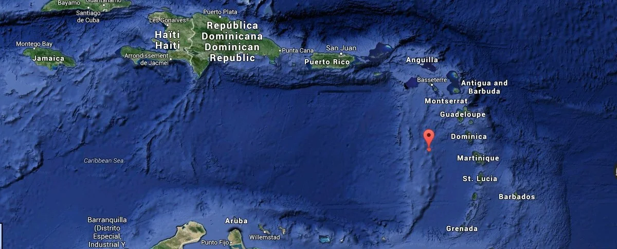 Serenity 2015.02.17, 8 am: 15°00’N 62°53’W, just west of Dominica. Serenity is the red drop on the map.