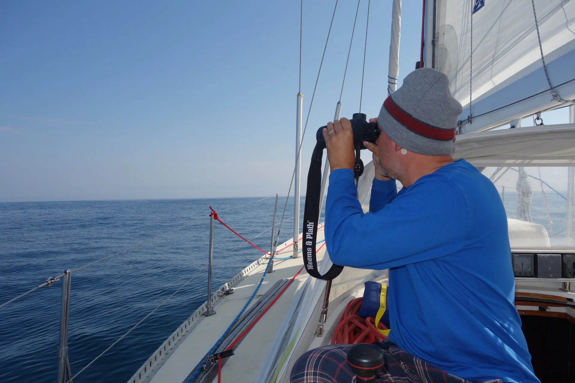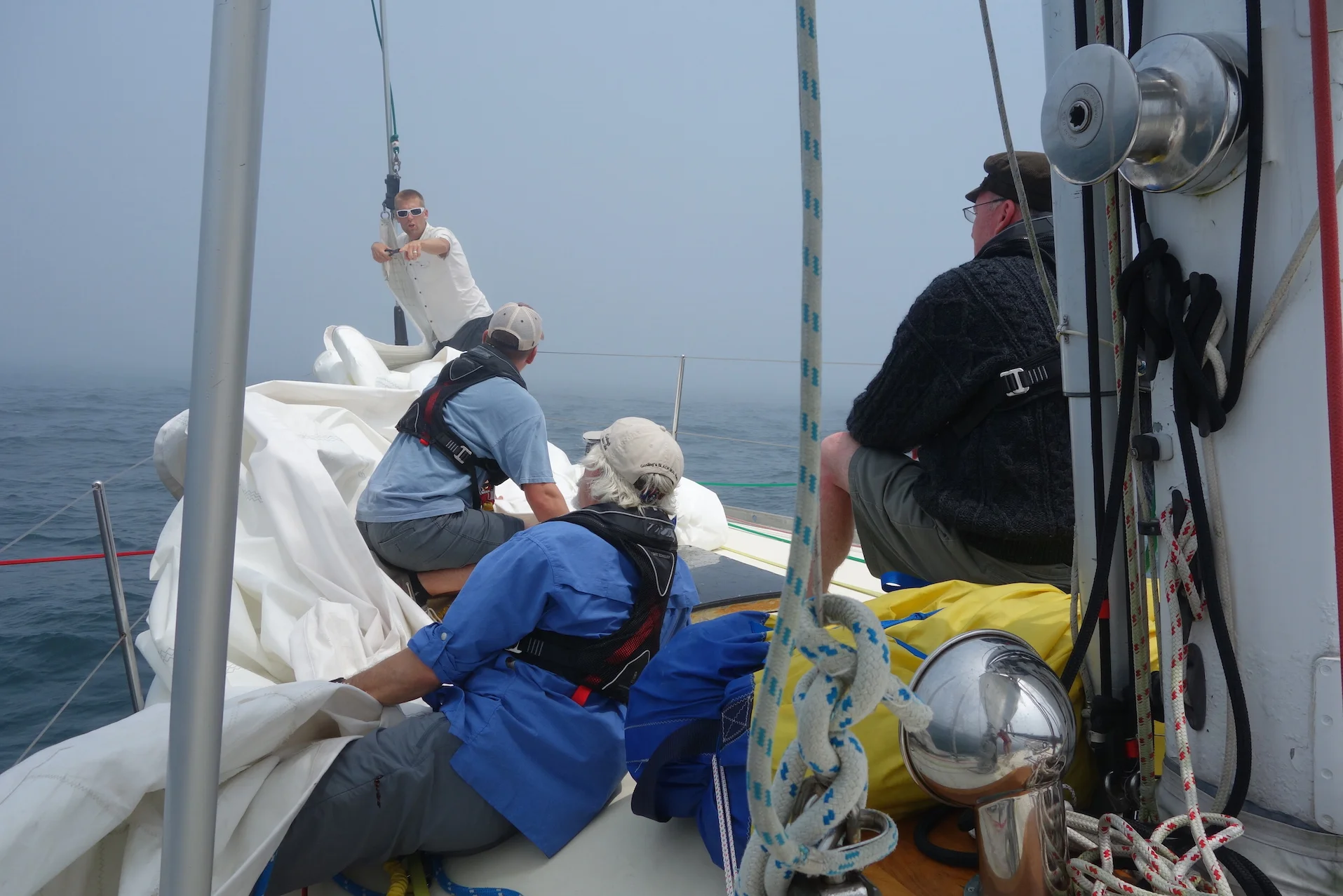 And the fog! I remember it from sailing Arcturus up here four years ago, but I don't recall it being so persistent then. For the past 36 hours until just now, we've been socked in, our world shrunk to a quarter-mile circle around the boat, with the air so damp that the backstay was literally raining condensation onto the head of whomever was at the wheel. Dan was determined to get the radar functioning, and did so in fact, adding a small level of comfort to our sailing blind, but we remained vigilant. Our only company though was the odd bird chirping around the boat and the many dolphins who've come along for a visit, plus the odd basking shark lolling about on the surface, it's fin sticking up and making it look a lot more menacing than it really is. 'They're the hippies of the shark family,' John wryly remarked. Since leaving the waters around Nantucket, we've seen exactly one fishing boat visually, and perhaps three or four more on AIS, so it's pretty quiet out here.