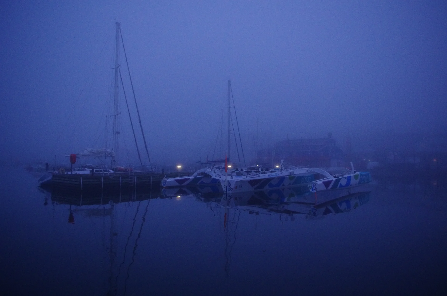 As we passed the final breakwater and entered the inner harbor, where the yacht club is based, the familiar wharf appeared out of the pre-dawn gloom. A few sailboats were tied alongside, including Oman Sail, a rig-less MOD70 trimaran that had pitch-poled on the Grand Banks in the recent Quebec-St. Malo Race (click here and here for the other news updates of this story). They were sailing in the same heavy weather that we’d escaped by diverting to Louisbourg on our leg north to St. John’s. The five-man crew were miraculously plucked out of the freezing cold water and safely rescued. Days later, part of the crew returned with a salvage tug and managed to locate the upturned boat out on the Grand Banks. By drilling holes in one of the outer hulls and filling it with water & chain, they righted the boat and towed her the several hundred miles into St. Pierre. She remains here now, being prepared to be loaded onto a freighter and shipped to France where her fate will be decided.