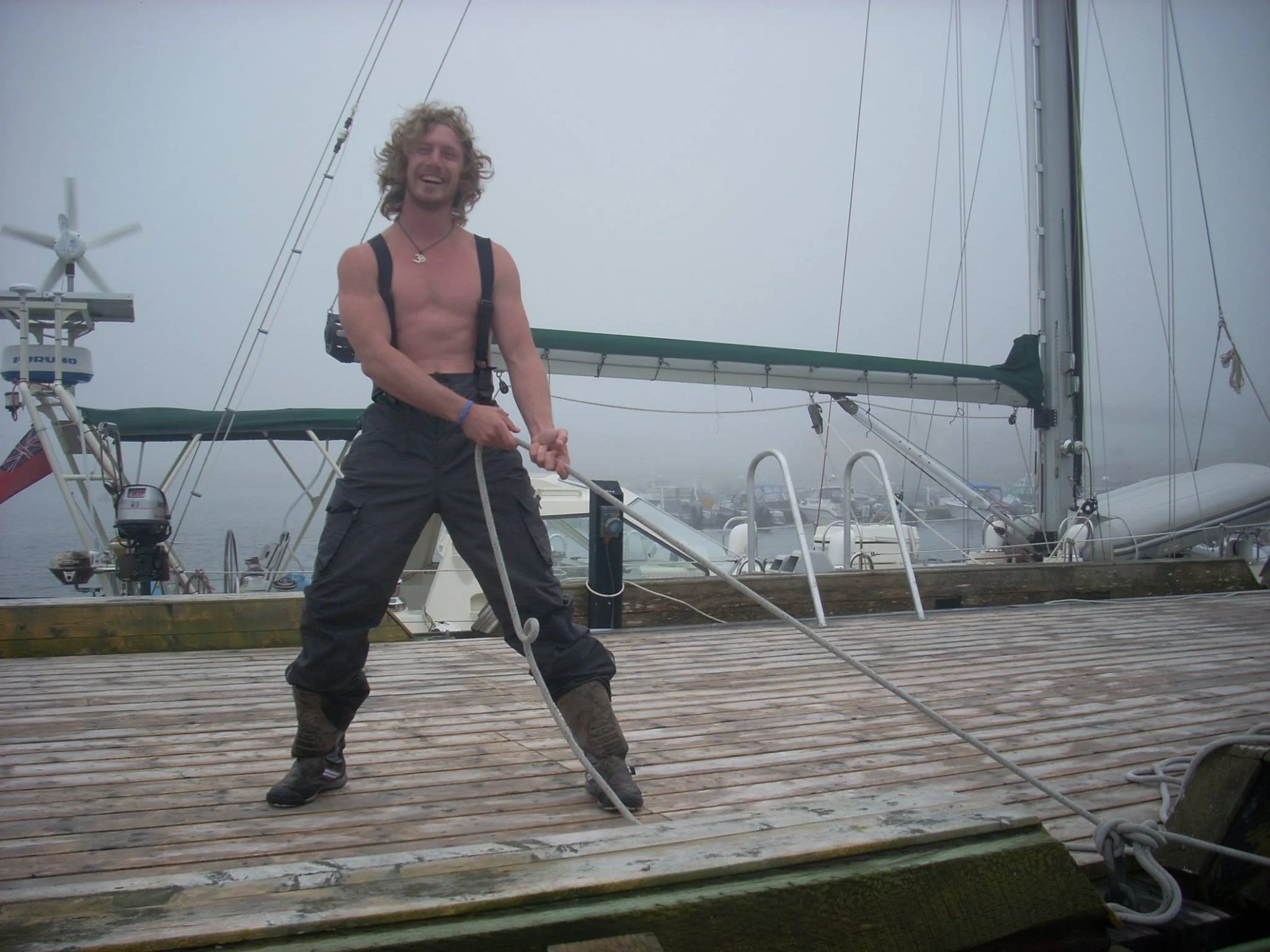 Clint helping tie the docklines on Arcturus in St. Pierre in 2011, en route across the Atlantic.