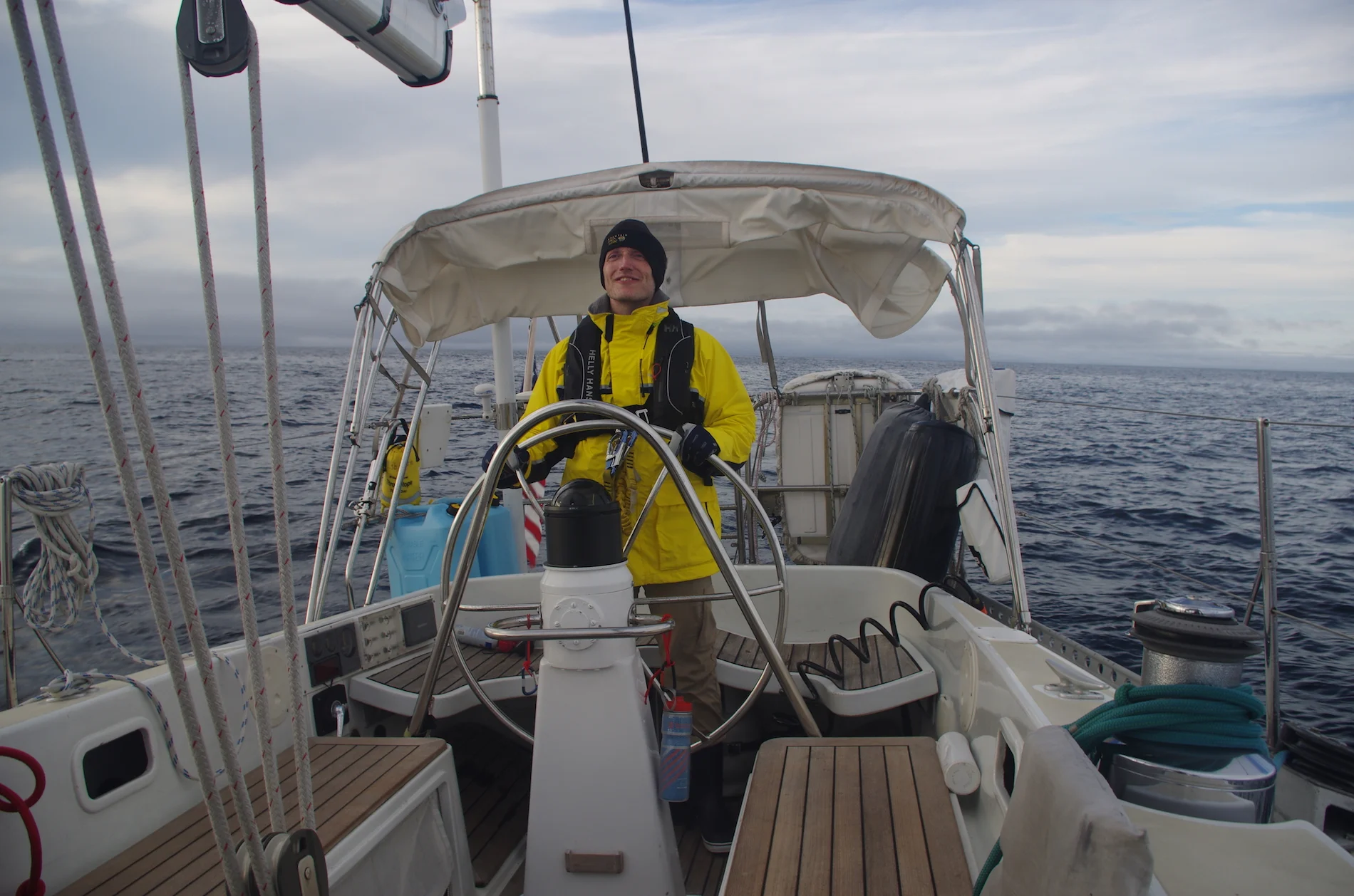 Doug at the helm on a rare moment of clear skies shortly after leaving St. John's. It wouldn't last!