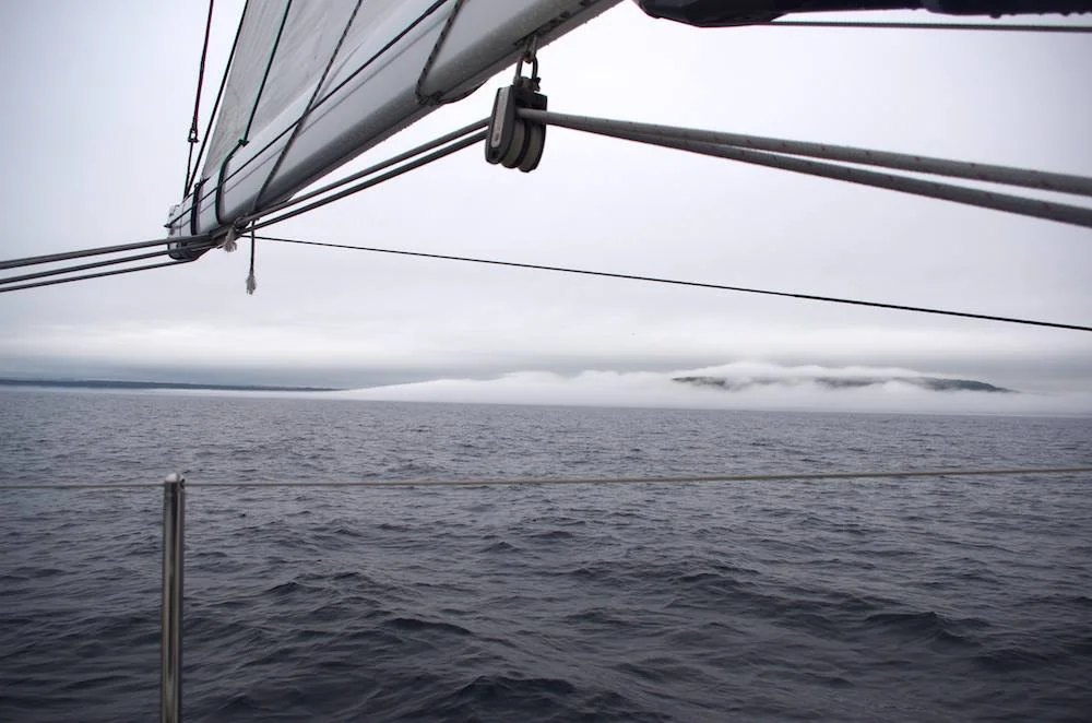 Finally, around midday, with 40 or so miles to go, the weather changed for good. The fog lifted and stayed lifted and the first chink in the low layer of clouds opened up suddenly to reveal a blue sky filled with the puffy cumulous so common with the onset of fair weather. Almost as suddenly a westerly breeze tickled the water and immediately filled in at a gusty 15 knots, propelling Isbjorn along the coastline at nearly hull speed in the flat, sheltered water along the cliffs. Farther offshore, maybe 5 miles or so, you could see the heavy fog that remained over the Grand Banks. But we were in the clear.