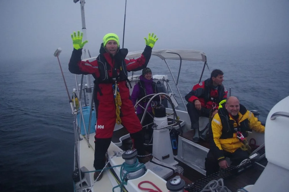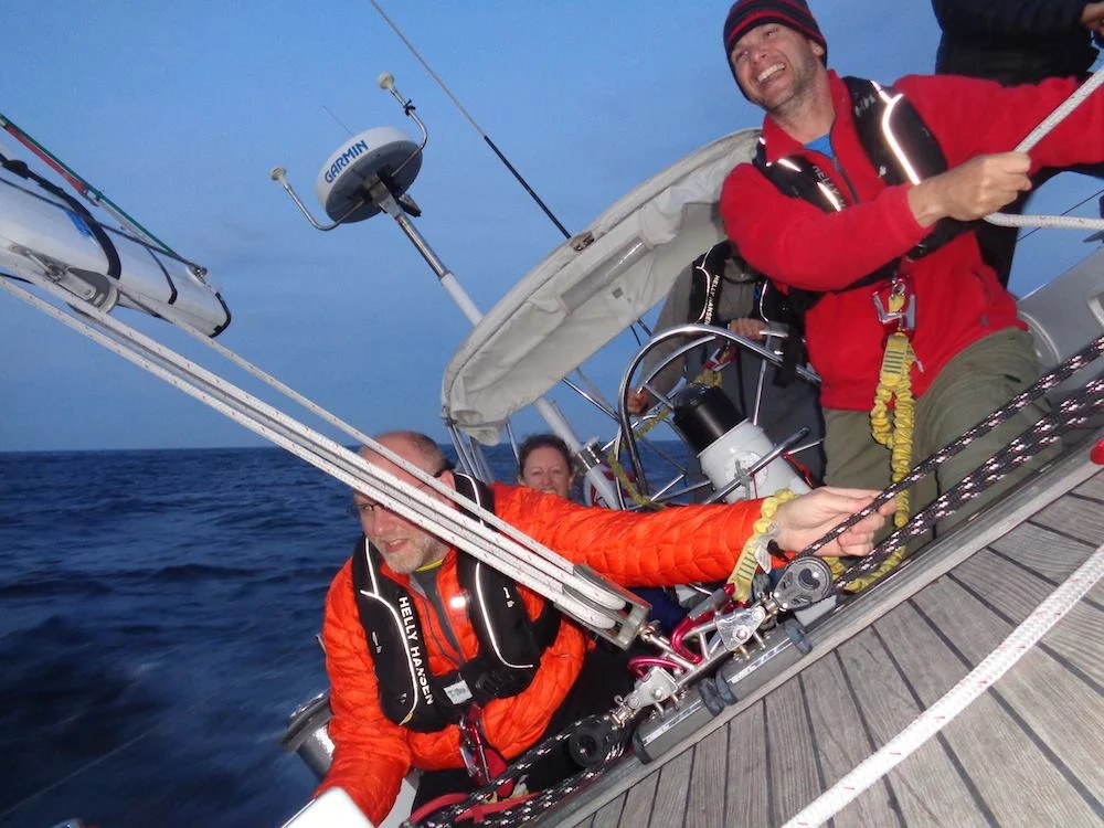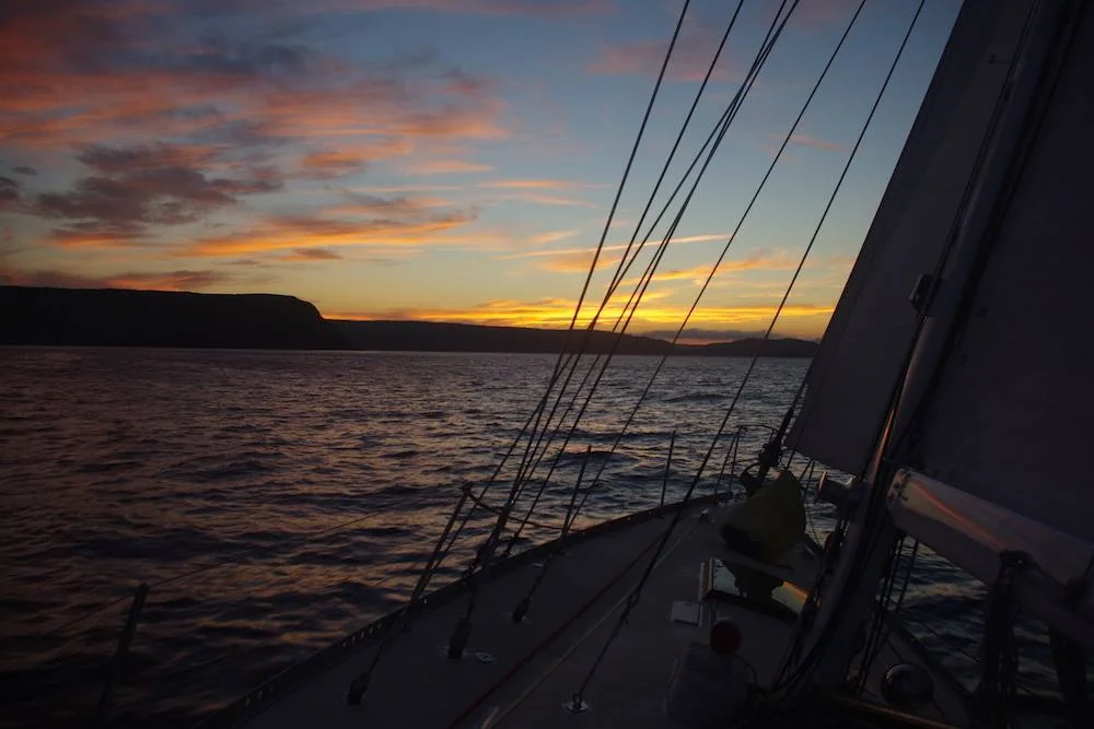 We approached Cape Spear, the easternmost point on North America, just before sunset and just as the nearly full moon was rising to the east. The wind had backed around to the southwest enough for us to sheet the sails in and lay the course for St. John’s harbor close-hauled, burying the lee rail as we charged along the last 4 miles of our passage, way overpowered once clear of the shelter from Cape Spear, but having one hell of a time. Dave was on the helm while James feathered the mainsheet and Dan L. trimmed the genoa.
